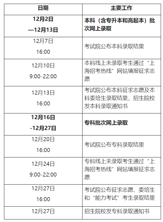 2024年上海市成人高校招生录取工作将于2024年12月2日至2024年12月27日进行。录取将分为两个批次进行:本科批次(含高中起点升本科、专科起点升本科)和专科批次(高中起点升专科)。考生可根据录取日程安排(见附件),及时查询录取结果和了解征求志愿等信息。