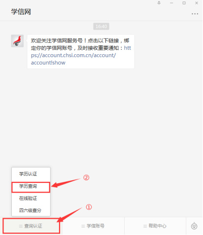 考生通过关注学信网官方公众号(微信搜索:学信网),在公众号菜单栏中点击“查询认证”→“学历查询”,在在跳转页面在跳转页面输入证书编号、姓名及验证码进行查询。