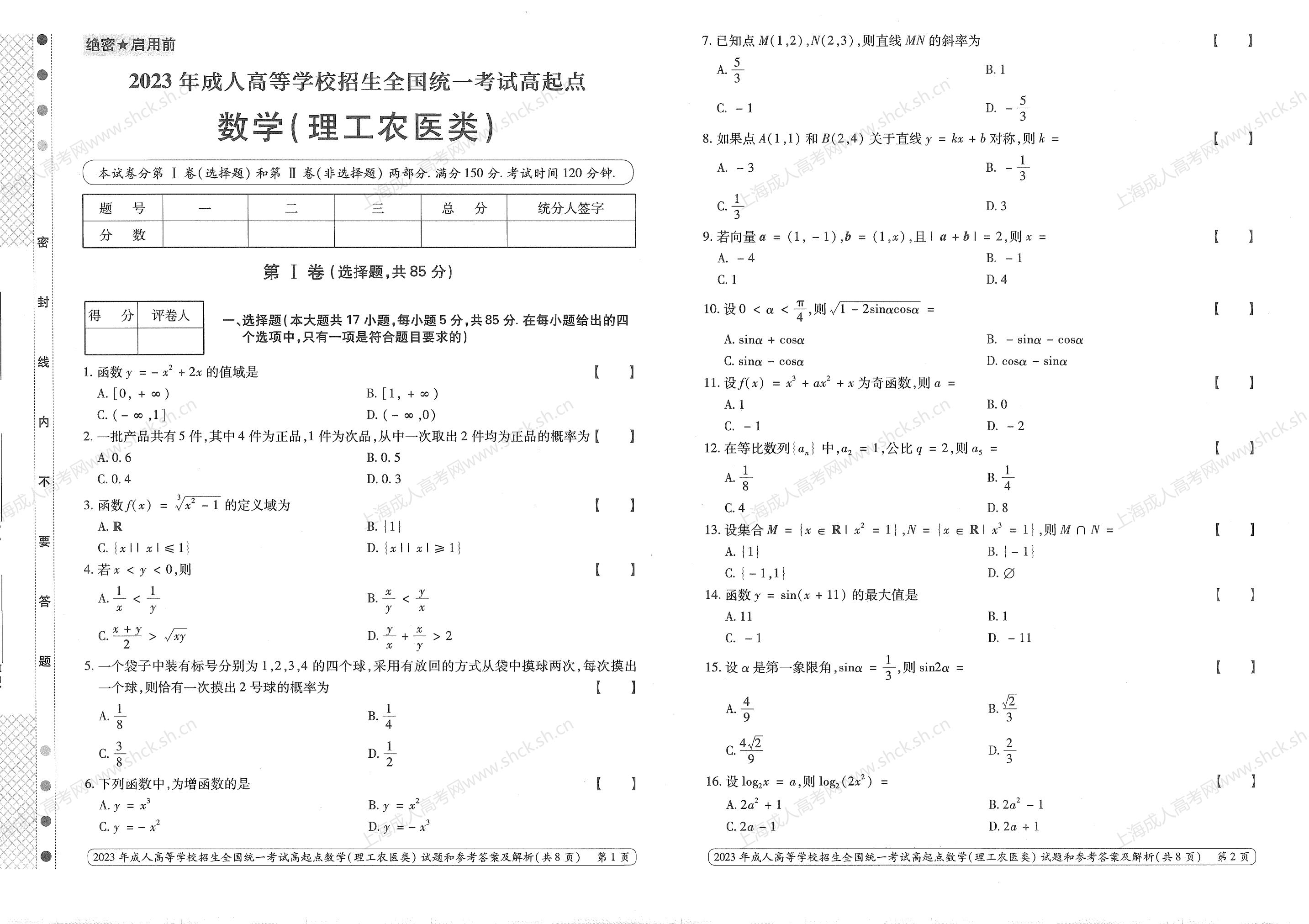 2023年上海成人高考高升专考试科目《数学(理科)》真题