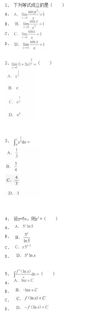 2020年上海市成人高考专升本《高等数学一》练习题五